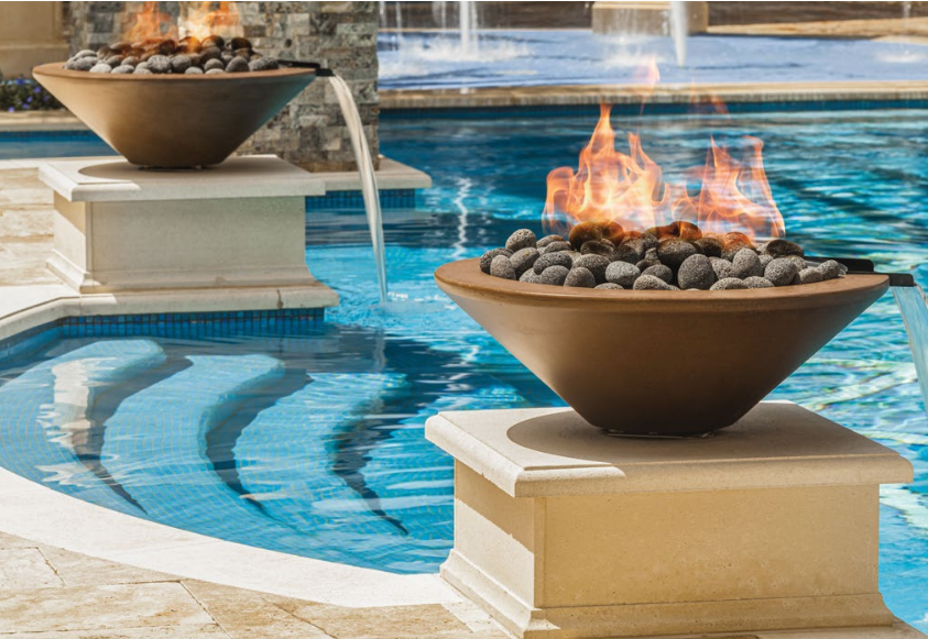 Fire & Water Bowls create a dramatic focal point that blends the calming motion of water with the warmth and brilliance of live flame, transforming any poolscape into a luxury resort-style environment. Designed with a proprietary CSA-certified burner and advanced SmartSense automated technology, these features provide both beauty and safety while delivering consistent performance and effortless operation. Whether placed along a raised wall, pool edge, or outdoor living space, the combination of firelight reflecting across flowing water produces a captivating visual experience that enhances ambiance day or night. Homeowners can personalize their design by selecting from a stunning collection of handcrafted copper, metallic, or concrete bowls, each offering unique textures and finishes that complement modern, traditional, or contemporary outdoor aesthetics. Available in elegant Corinthian, Essex, Legacy, and Biltmore styles, Fire & Water Bowls allow designers and builders to introduce a bold architectural statement that elevates luxury pool projects while adding movement, sound, and a warm, inviting glow to the entire backyard setting.